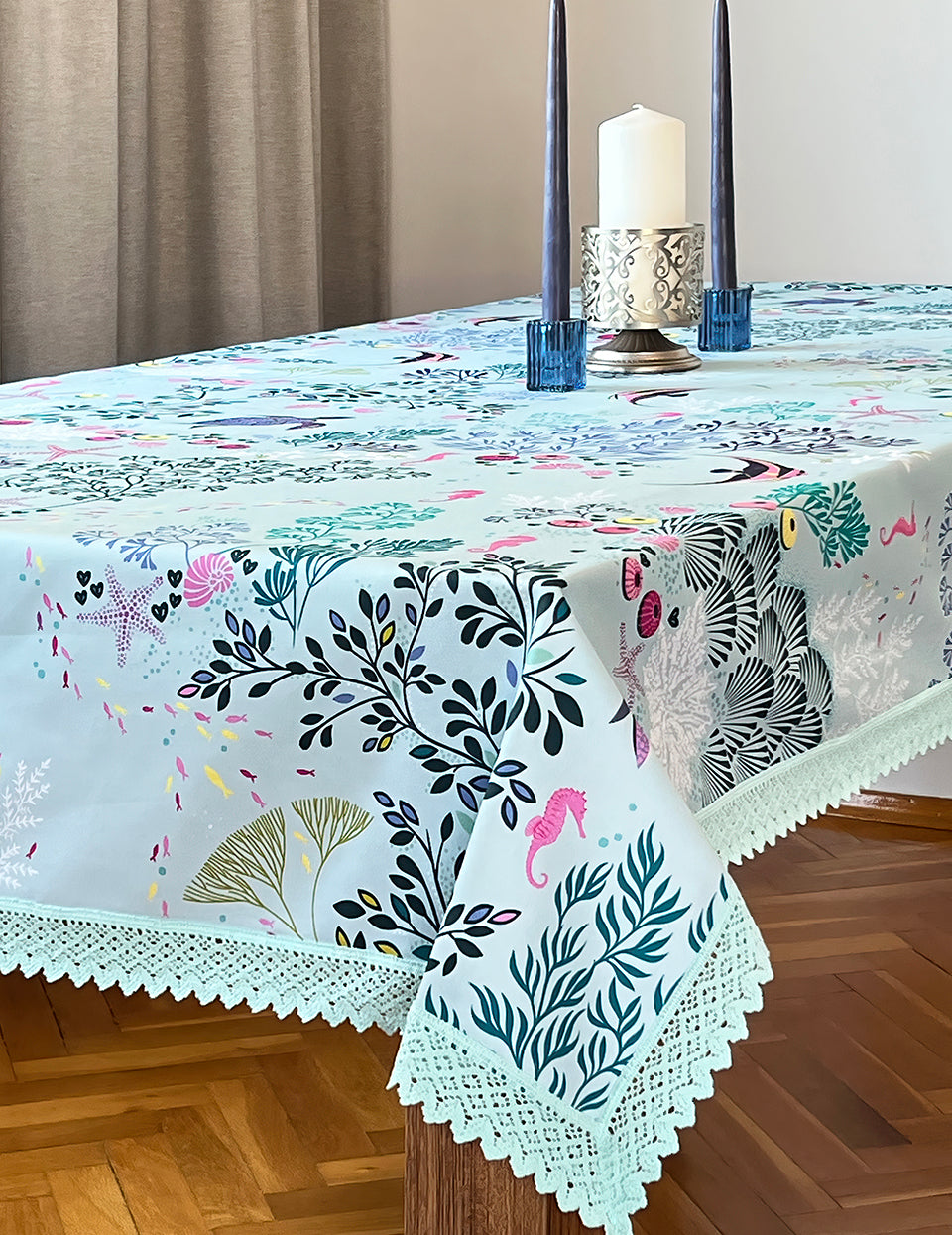 Ocean Su altı Temalı 147cm x216 cm Yeşil Dantelli Pamuklu Masa Örtüsü